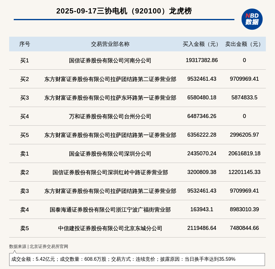 每經(jīng)訊,2025年9月17日,北交所上市公司三協(xié)電機(920100,收盤價:86.38元)登上龍虎榜,交易方式是連續(xù)競價,披露原因是當日換手率達到35.59%,成交數(shù)量608.6萬股,成交金額5.42億元。買一席位為國信證券股份有限公司河南分公司,買入1931.74萬元;賣一席位為國金證券股份有限公司深圳分公司,賣出2061.68萬元。