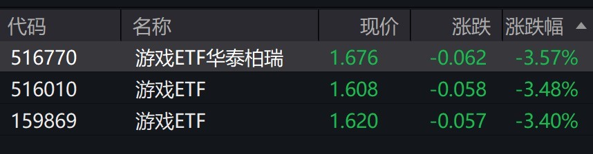 受盤面影響,游戲ETF跌超3%。