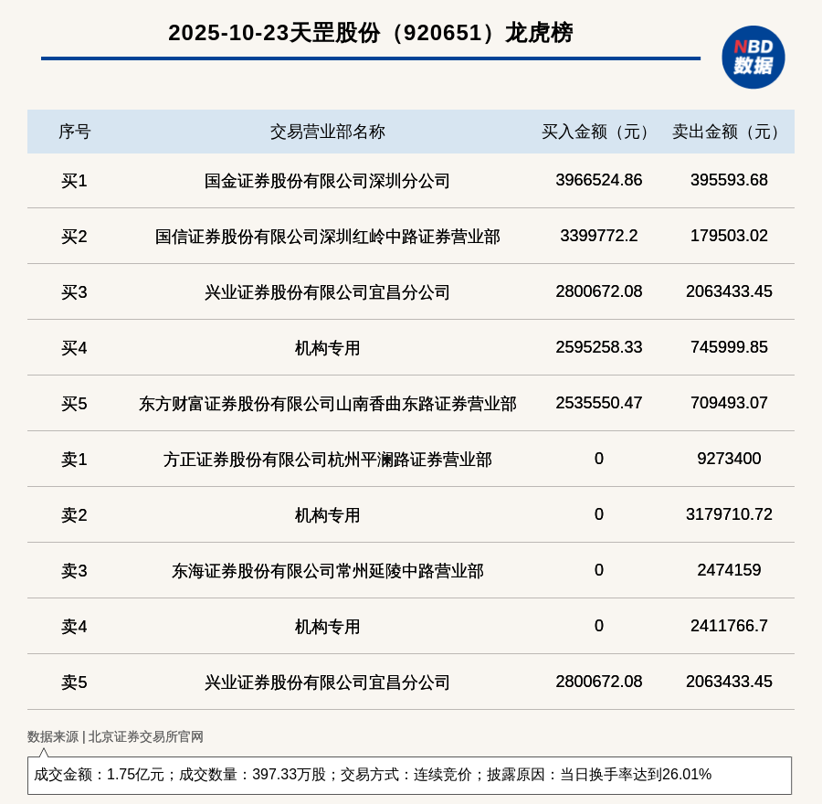 每經(jīng)訊,2025年10月23日,北交所上市公司天罡股份(920651,收盤價:43.87元)登上龍虎榜,交易方式是連續(xù)競價,披露原因是當(dāng)日換手率達(dá)到26.01%,成交數(shù)量397.33萬股,成交金額1.75億元。買一席位為國金證券股份有限公司深圳分公司,買入396.65萬元;賣一席位為方正證券股份有限公司杭州平瀾路證券營業(yè)部,賣出927.34萬元。