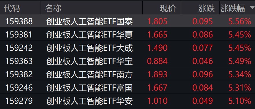 受盤面影響,創(chuàng)業(yè)板人工智能相關(guān)ETF漲超5%。