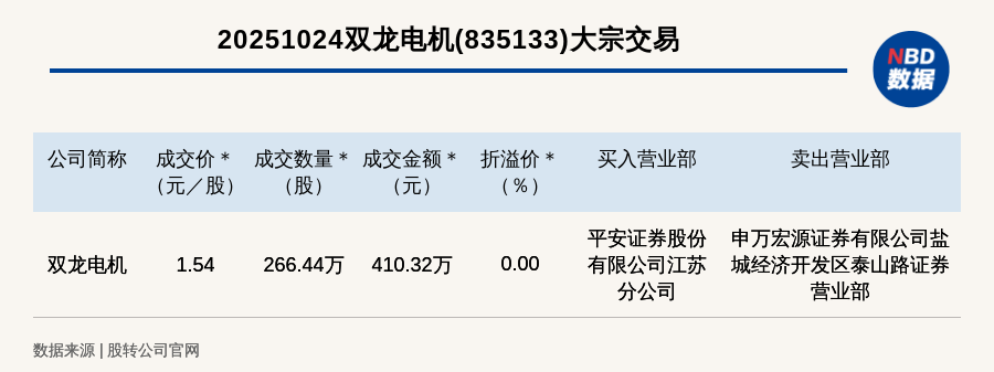 每經(jīng)訊,2025年10月24日,新三板創(chuàng)新層公司雙龍電機(jī)(835133,收盤(pán)價(jià):1.54元)發(fā)生一筆大宗交易,成交價(jià)1.54元/股,成交數(shù)量266.44萬(wàn)股,成交金額410.32萬(wàn)元,為平價(jià)交易。買(mǎi)入營(yíng)業(yè)部是平安證券股份有限公司江蘇分公司,賣出營(yíng)業(yè)部是申萬(wàn)宏源證券有限公司鹽城經(jīng)濟(jì)開(kāi)發(fā)區(qū)泰山路證券營(yíng)業(yè)部。