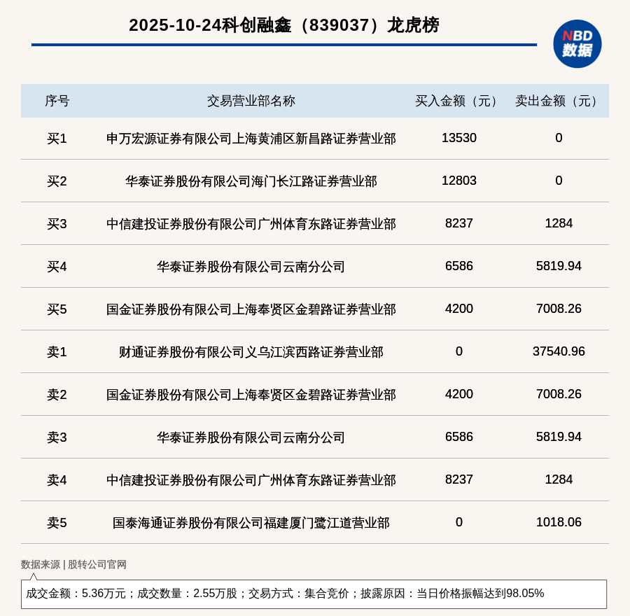 每經(jīng)訊,2025年10月24日,新三板創(chuàng)新層公司科創(chuàng)融鑫(839037,收盤價:2.17元)登上龍虎榜,交易方式是集合競價,披露原因是當日價格振幅達到98.05%,成交數(shù)量2.55萬股,成交金額5.36萬元。買一席位為申萬宏源證券有限公司上海黃浦區(qū)新昌路證券營業(yè)部,買入1.35萬元;賣一席位為財通證券股份有限公司義烏江濱西路證券營業(yè)部,賣出3.75萬元。