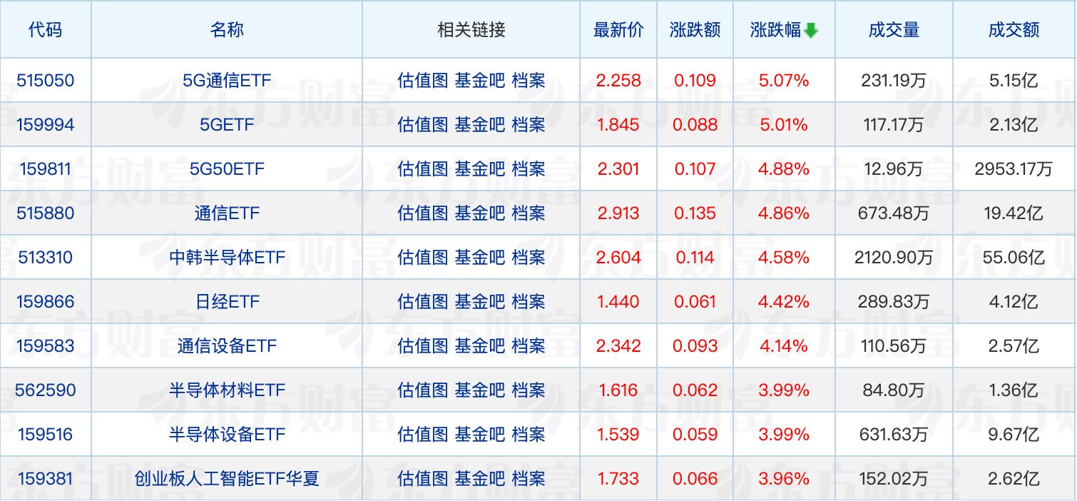 具體來看,5G、通信相關(guān)ETF全線走強(qiáng),最高漲5.07%。