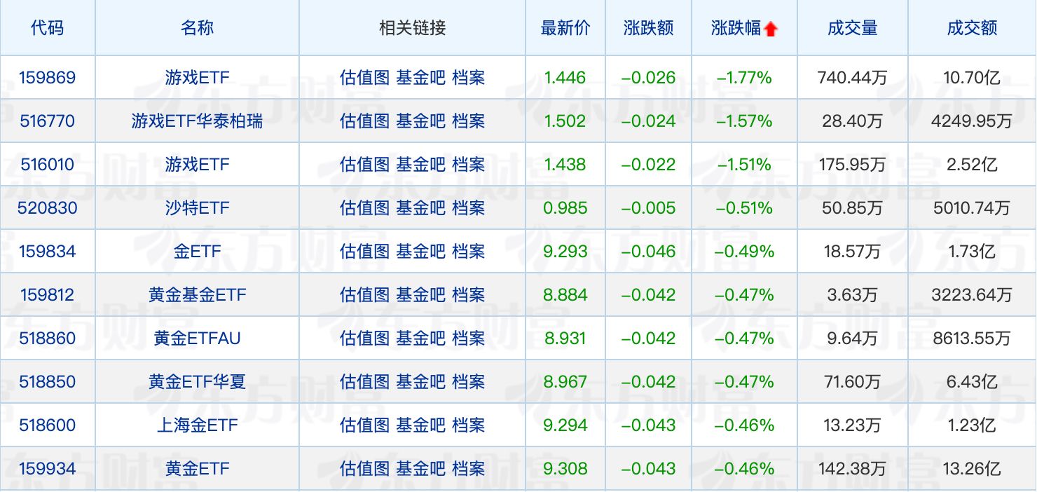 下跌方面,多只游戲ETF回調(diào)居前,最高下跌1.77%。