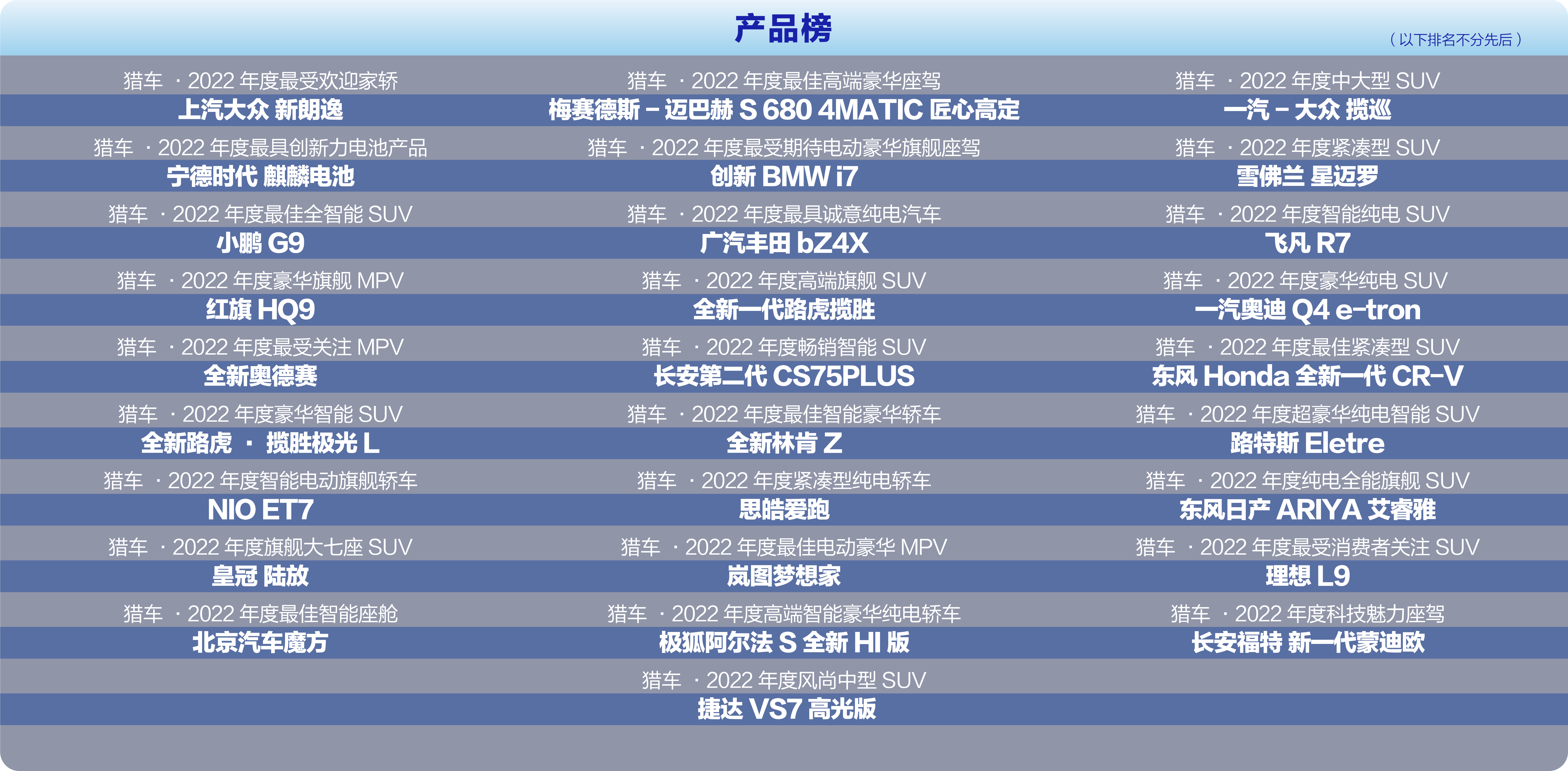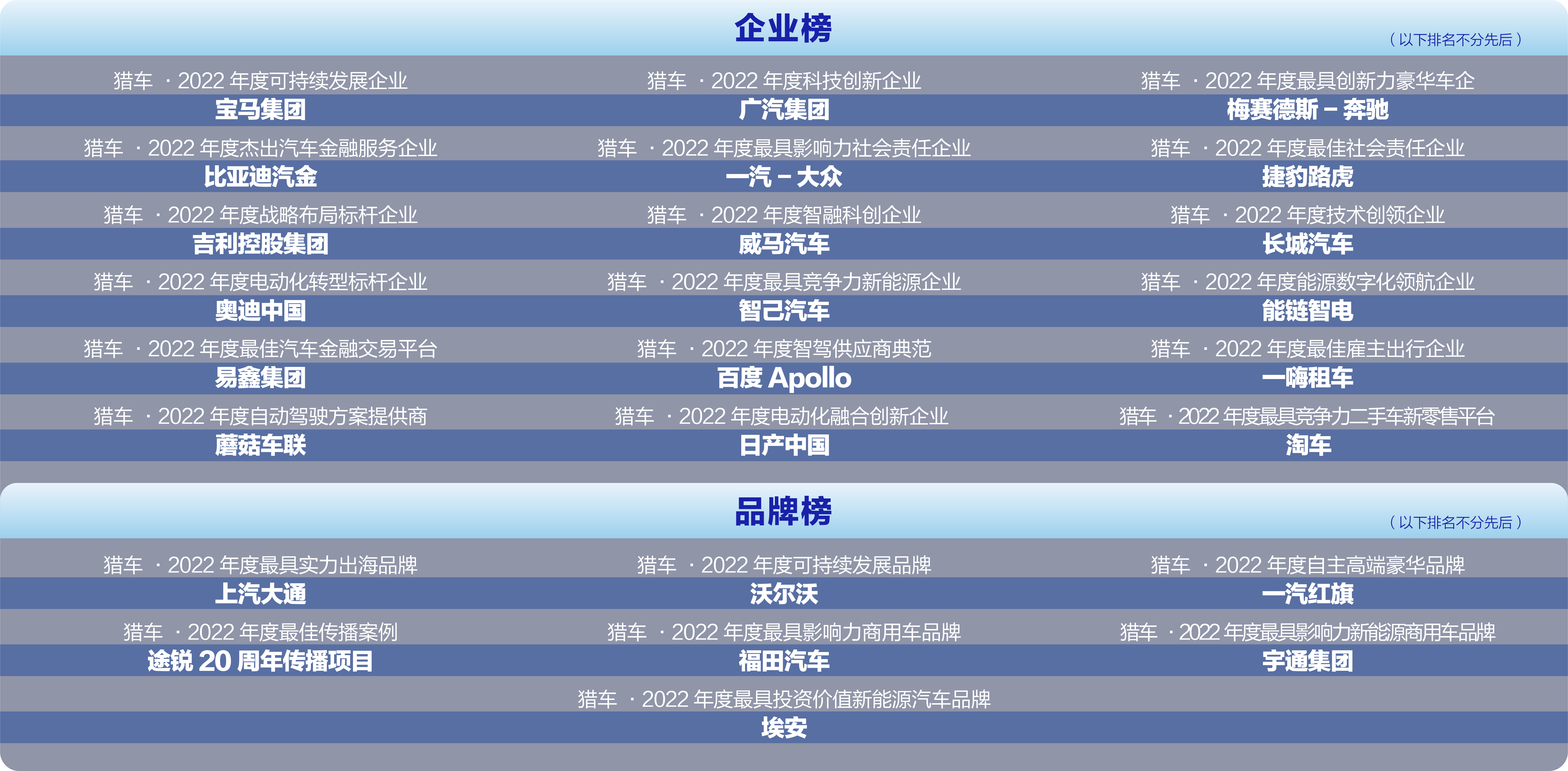 “中國獵車榜” 由每日經(jīng)濟新聞于2008年正式發(fā)起,旨在作時代變局的見證者,汽車產(chǎn)業(yè)革新的推動力。 十余年來,中國獵車榜始終堅持“公開、公平、公正”的原則募集獎項申請,組織行業(yè)專家和知名媒體人進行集中評審,全面覆蓋整車企業(yè)及產(chǎn)業(yè)鏈上下游企業(yè),獲得了行業(yè)同仁的認可和大力支持,如今,中國獵車榜已成為行業(yè)最具權(quán)威和影響力的獎項評選之一。 基于此, 《每日經(jīng)濟新聞》 將于2022年11月23日在線上舉辦以 “向新而生 創(chuàng)享末來”為主題的第十四屆中國獵車榜,與行業(yè)專家、高校學(xué)者、企業(yè)高管相聚云端,共話未來!